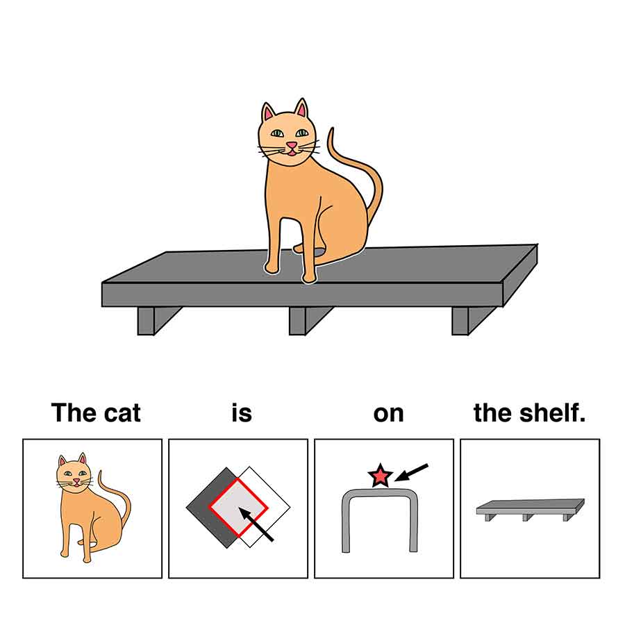 The cat is on the shelf.