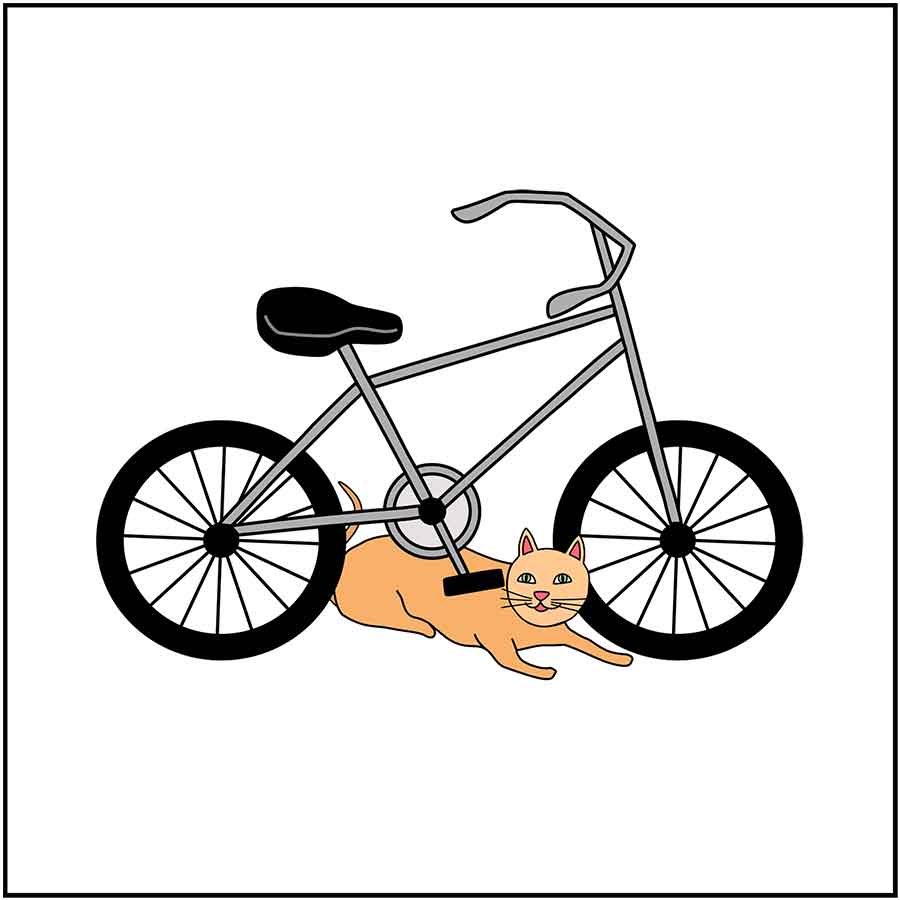 The cat is under the bike.